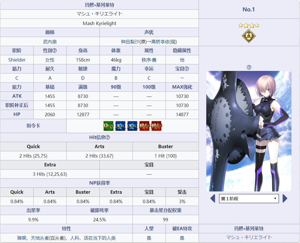 游戏的看板之一,所有玩家初期就可以使用的角色,是目前全游戏唯一一名盾兵【Shielder】,宝具和技能组也完全设置为防御系。