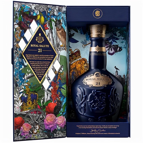 1953年,英国女王伊丽莎白二世加冕,酒厂为了向皇家致敬,以鸣礼炮的传统为名设计了高端系列皇家礼炮(Royal Salute)这个名字起源于一个古老的传统:皇家海军为了表达最高敬意,鸣放21响礼炮。从对存放酒液的橡木桶的苛刻选择就能看出“皇家礼炮”酿造的隆重,首先,它要足够牢固以保证能长时间存放,其次,它必须曾存放过西班牙雪利酒或美国波本威士忌。最为关键的是酒液要经过至少21年的醇化,这样不论是酒款还是包装都环环紧扣王室主题的创意,一问世便大受好评,后来更是成为公司长盛不衰的独立品牌。