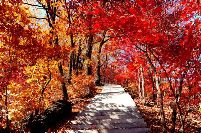 当枫树成片,形成枫林时,深秋的景色极美,观赏性极强。姹紫嫣红的枫叶是大自然赐予辽宁的瑰宝。