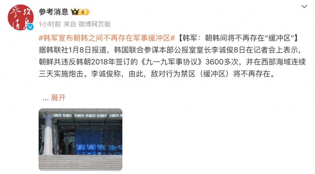 1月8日,半岛形势又有新动向。参考消息援引韩联社报道,韩国联合参谋本部公报室室长李诚俊当天在记者会上表示,朝鲜共违反韩朝2018年签订的《9·19韩朝军事协议》3600多次,并在西部海域连续三天实施炮击。由此,敌对行为禁区(缓冲区)将不再存在。