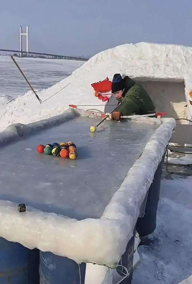 32 在冰桌上玩台球,大哥可千万别用力大了啊,我怕球停不下来!