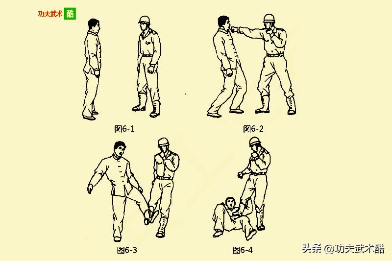 敌我双方相对而立(图6-1)。我方向前上右步,同时用右直拳击打敌方的面部(图6-2)。紧接着,我方用右脚由外向里勾踢敌方的左脚踝关节(图6-3)。在敌方倒地后,用右脚猛力向下踩踏敌方的左肋(图6-4)。