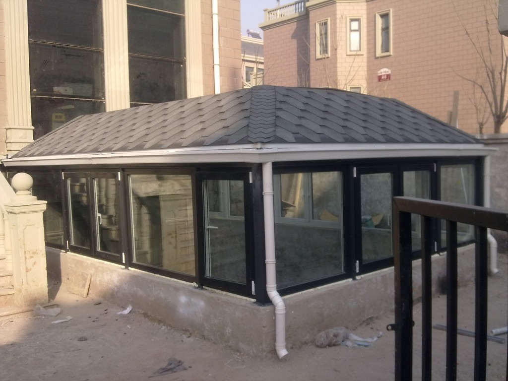 另外成品树脂瓦也是现在使用率非常高的一种阳光房顶面材料,因为成品的树脂瓦本身的隔热性能很好,所以安装在阳光房顶部的话,也可以起到一定的隔热效果。