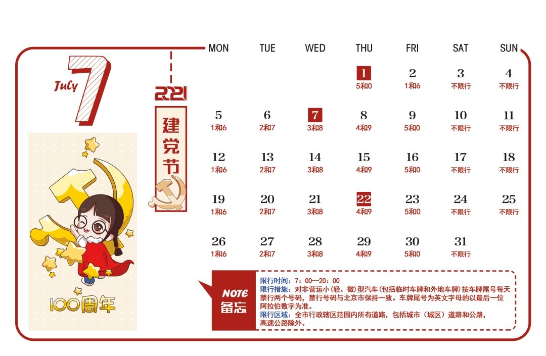 7月最新限行日历