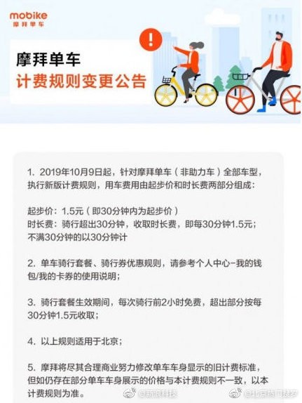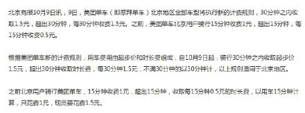 经济观察【美团单车上调北京地区收费标准:每30分钟收1.5元】9日,美团单车(即摩拜单车)北京地区全部车型将执行新的计费规则,30分钟之内收取1.5元,超出30分钟,每30分钟收费1.5元。之前,美团单车北京用户骑行15分钟收费1元,超出15分钟,每15分钟收费0.5元。记者登录哈啰单车、滴滴和ofo发现,以上三家的共享单车在北京的计费规则未变,其中哈啰单车是每15分钟1元,滴滴的青桔单车15分钟之内收取1元,超出15分钟部分,每15分钟收取0.5元;ofo的车费按小时计,1小时收1元,不满1小时按1小时收取。