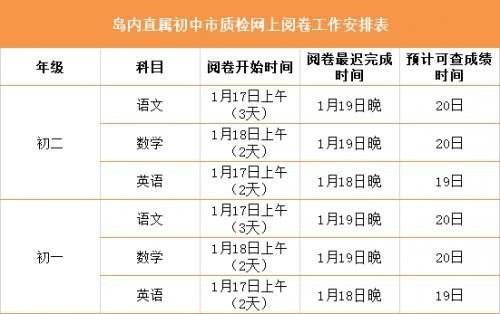 初中只有初三年所有学科和初二年地理和生物是统一改卷,其他由各区自己举行,从表格看,岛内市直属校其他年级和学科有统一改卷。