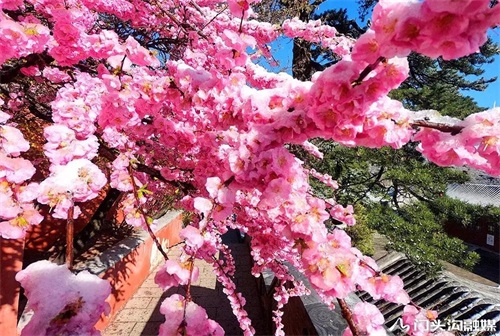 春雪、桃花、蓝天
