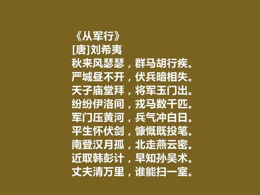 刘希夷的边塞诗则展现了他诗歌风格的另一面。如《从军行》:“秋天风飒飒,群胡马行疾。严城昼不开,伏兵暗相失。天子庙堂拜,将军凶门出。纷纷伊洛道,戎马几万匹。军门压黄河,兵气冲白日。平生怀仗剑,慷慨即投笔。南登汉月孤,北走代云密。近取韩彭计,早知孙吴术。丈夫清万里,谁能扫一室。”