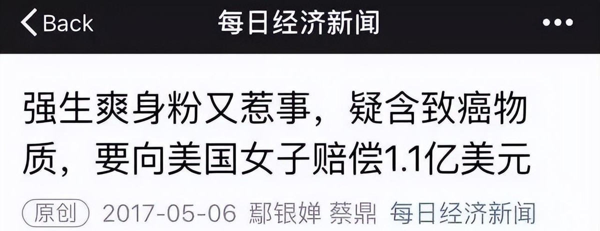 当时一位女性因为长期使用强生爽身粉而患上了间皮瘤这个罕见疾病最后获得了高达26亿美元的巨额赔偿。