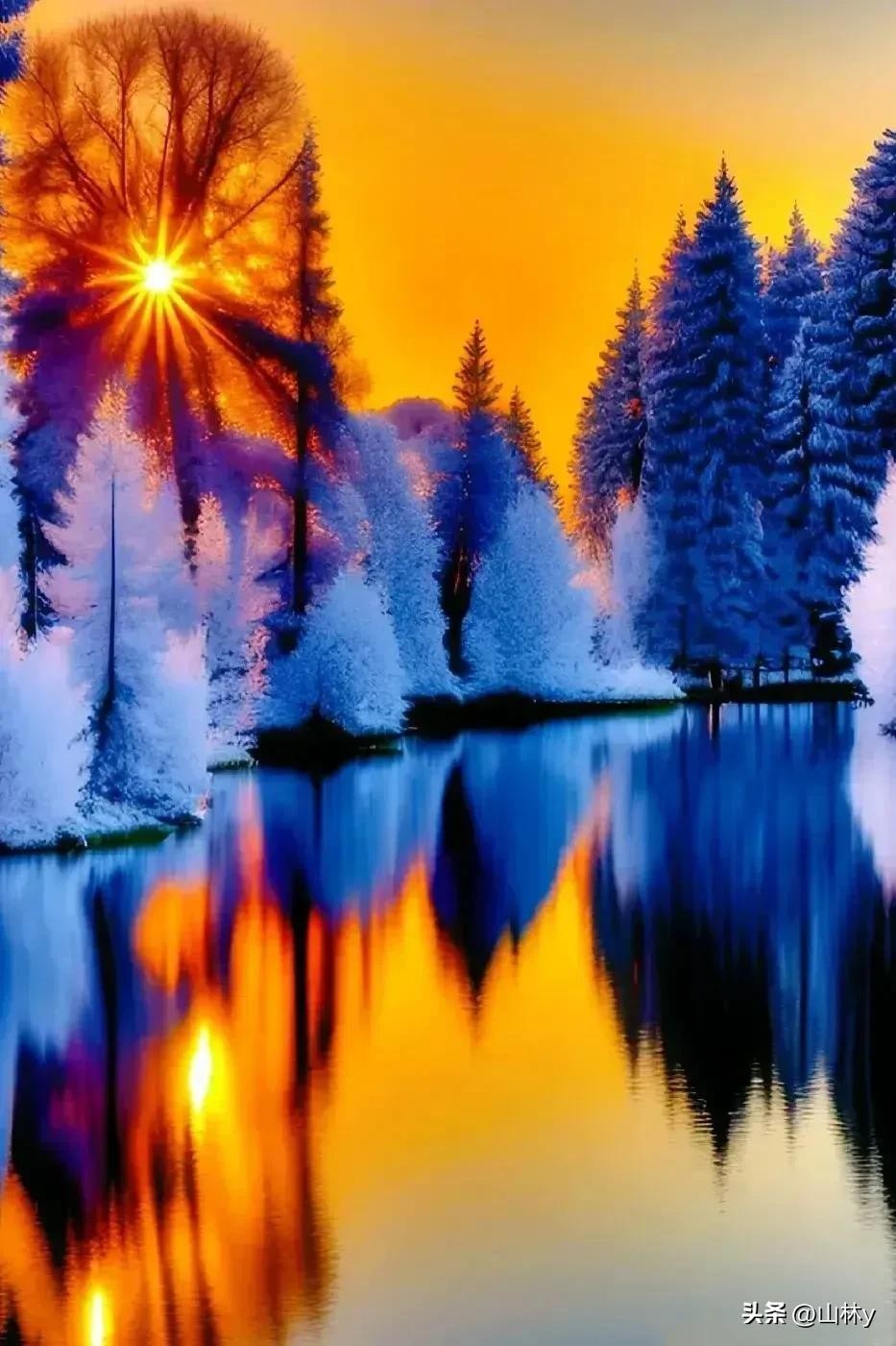 白雪皑皑,夕阳染红了西边的天空,景色无限壮美,令人深深沉醉。