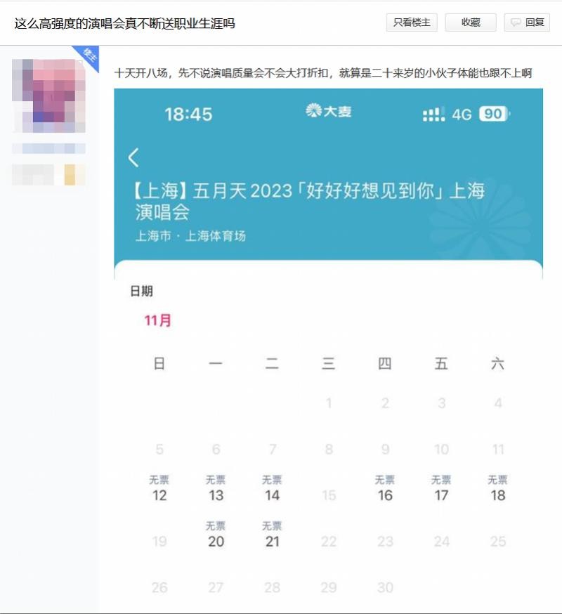 南都研究员留意到,这并非“五月天”首次遭遇质疑。今年9月,“五月天”西安演唱会期间,主唱阿信因在舞台吸氧登上热搜,当时就有歌迷指出,今年以来“五月天”长期保持高密度的演出排期,且不乏高温天气下的演唱会,这支5人年纪加起来快250岁的乐队,如何保证演出质量?11月初,再有网友在上海演唱会前夕发帖,质疑乐队成员体能如何支撑10天8场的演唱会密度。