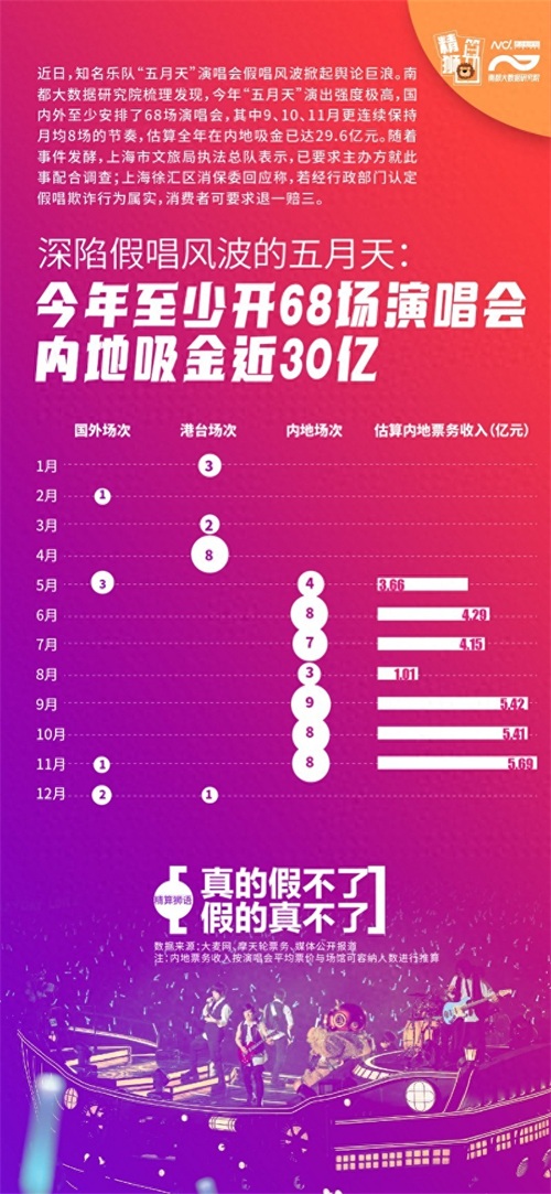 近日,知名乐队“五月天”演唱会假唱风波掀起舆论巨浪。南都大数据研究院梳理发现,今年“五月天”演出强度极高,国内外至少安排了68场演唱会,其中9、10、11月更连续保持月均超8场的节奏,估算全年在中国内地吸金已达29.6亿元。随着事件发酵,上海市文旅局执法总队表示,已要求主办方就此事配合调查;上海徐汇区消保委回应称,若经行政部门认定假唱欺诈行为属实,消费者可要求退一赔三。