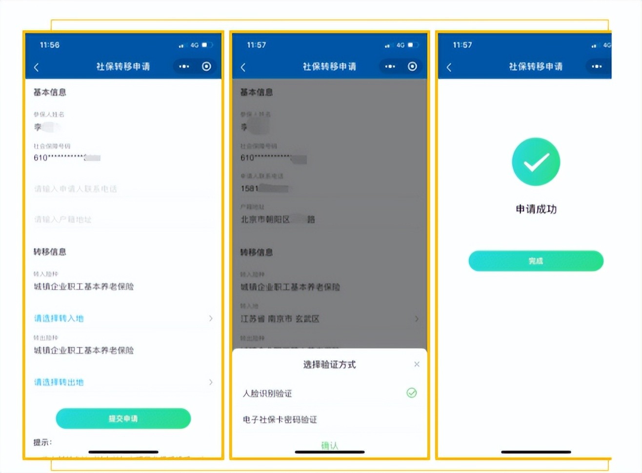 对于已开通网上申请的地区,您可以点击【全国服务—社保转移申请】服务,填写转移申请相关信息,并经人脸识别的实人认证后,提交申请。