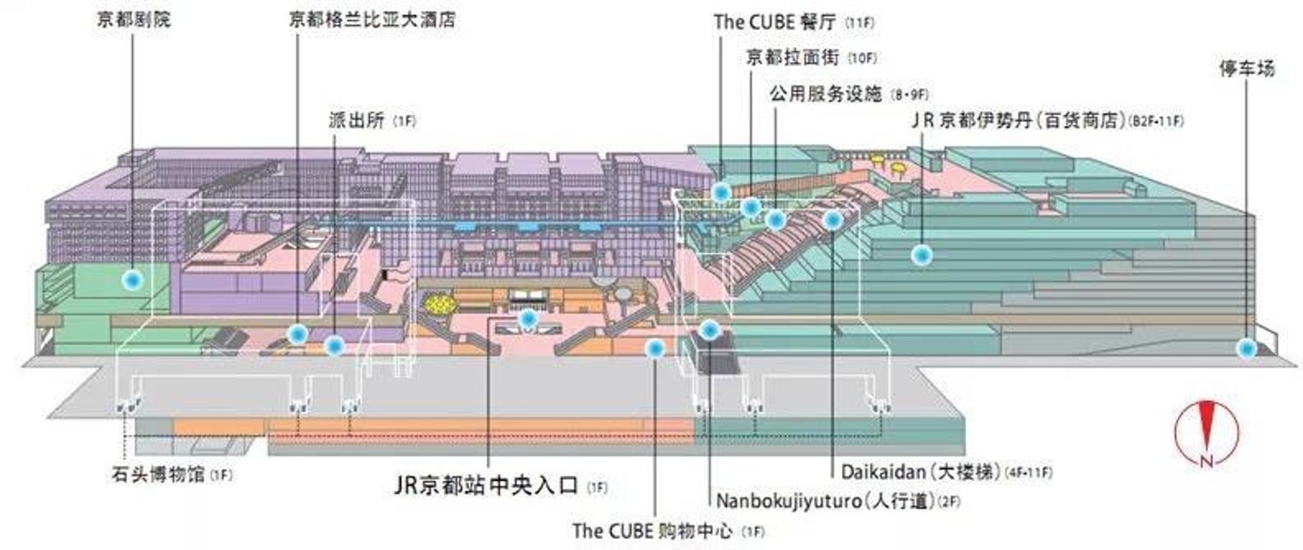 京都火车站的核心部分是一个巨大的中庭空间,它联系着室内外及各层的空间,各功能空间沿着大厅向左右两侧层叠式展开。见下图:
