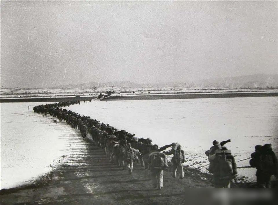 志愿军战士们穿着制式单衣装备,尽管寒风刺骨,却依旧英勇无畏的踏上了抗美援朝作战任务。