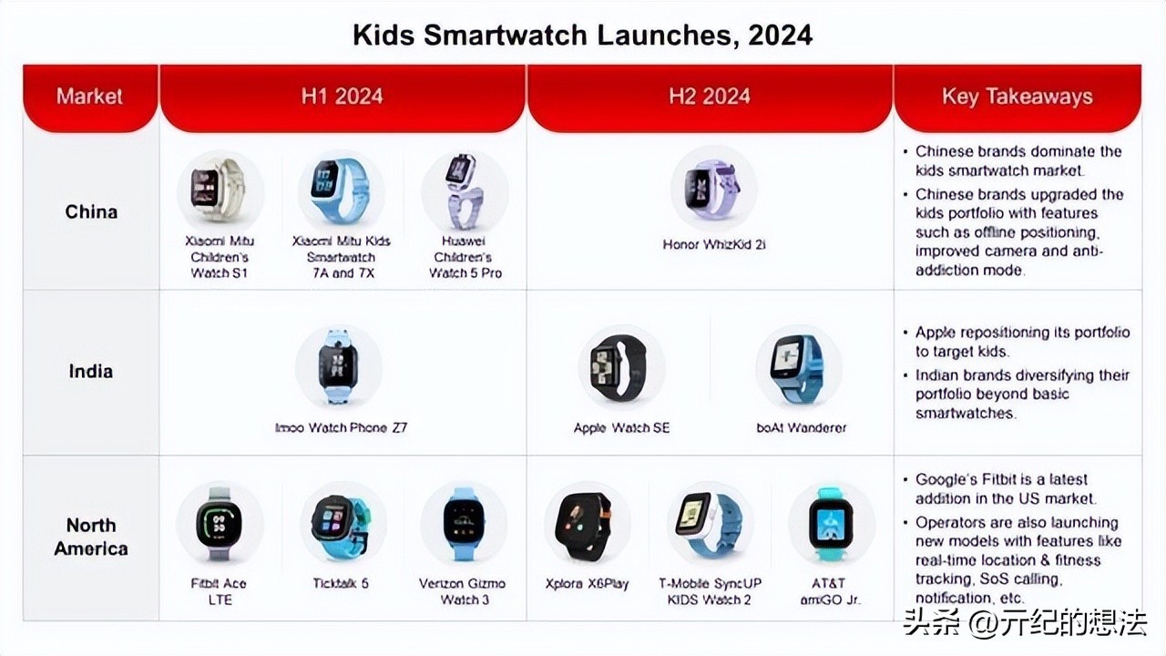 排名第三的是小米,它的市场份额仅为4%,不过也意味着一件事,那就是其他厂商的份额均低于4%。其他品牌总占比为38%,和排名第一的小天才差距是10%,除了海外品牌以外,亓纪还看到了360和荣耀等国产品牌。除了国内市场以外,其中北美市场的出货量增长了1.5倍,难怪传闻苹果要进入儿童智能手表市场。