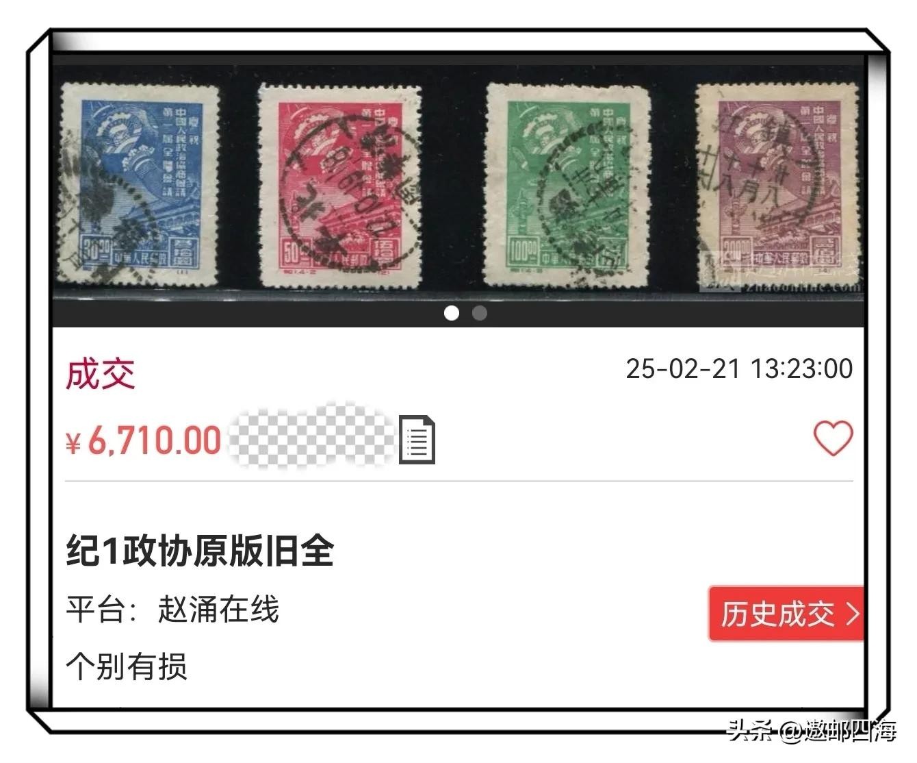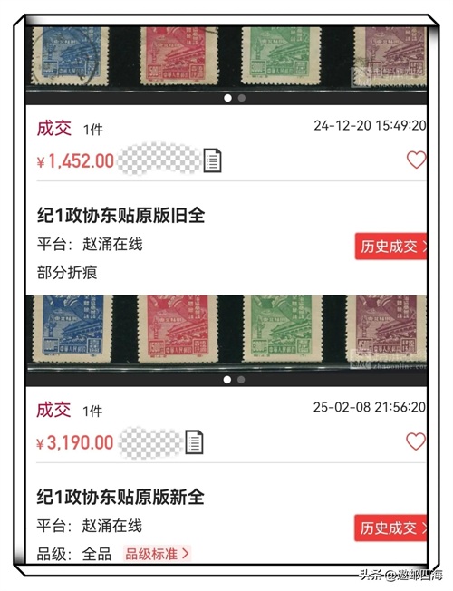 不知道为啥这套很普通的纪1《政协》原版信销旧邮票竟能以6710元的超高价格成交?仔细看看这套信销旧邮票除了第二枚盖了个全戳外,没有任何特别之处嘛。这个价格甚至比纪1“东贴”全品新票还要高出一倍多,有哪位精通此道的行家能看出什么原因吗?