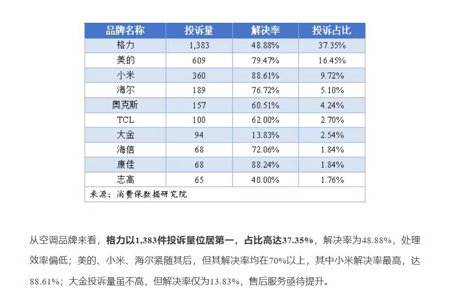 文章多次引用 " 消费宝数据研究院 " 数据,其中一部分内容称 " 格力投诉高居榜首、小米解决率突出 "。