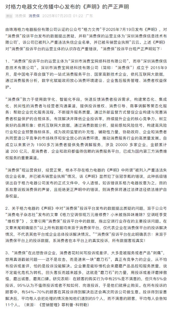 针对格力发文,7 月 20 日凌晨," 消费保 " 发长文回应,其称 " 消费保 " 现运营良好,经营正常,不存在格力电器的《声明》中所谓 " 被列入严重违法失信企业名单,并已被吊销营业执照 " 情况。