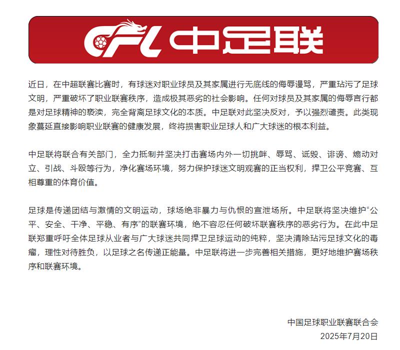 " 足球是传递团结与激情的文明运动,球场绝非暴力与仇恨的宣泄场所。中足联将坚决维护公平、安全、干净、平稳、有序的联赛环境,绝不容忍任何破坏联赛秩序的恶劣行为。在此中足联郑重呼吁全体足球从业者与广大球迷共同捍卫足球运动的纯粹,坚决清除玷污足球文化的毒瘤,理性对待胜负,以足球之名传递正能量。中足联将进一步完善相关措施,更好地维护赛场秩序和联赛环境。"