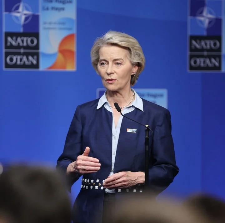 这是 6 月 24 日拍摄的欧盟委员会主席冯德莱恩在荷兰海牙北约峰会期间对记者讲话。新华社记者赵丁喆摄