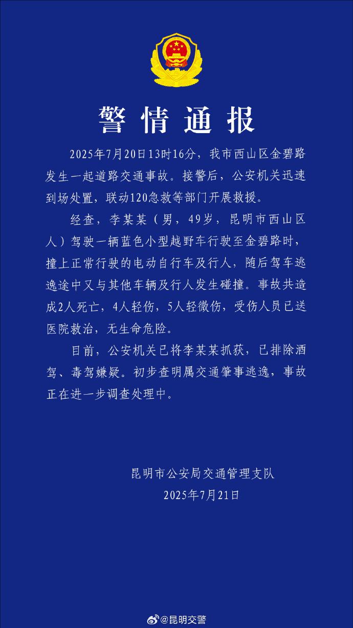 经查,李某某 ( 男,49 岁,昆明市西山区人 ) 驾驶一辆蓝色小型越野车行驶至金碧路时,撞上正常行驶的电动自行车及行人,随后驾车逃逸途中又与其他车辆及行人发生碰撞。事故共造成 2 人死亡,4 人轻伤,5 人轻微伤,受伤人员已送医院救治,无生命危险。