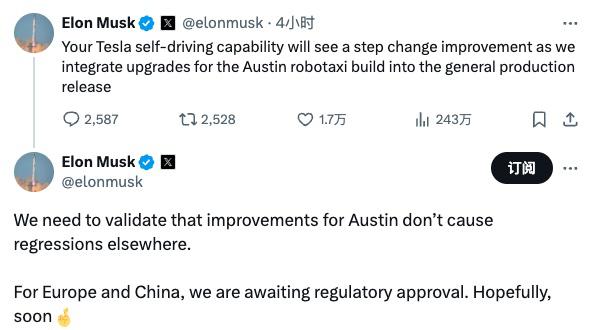 同时,他还明确上述改进不会造成其他地区的 FSD 性能倒退。此外,FSD 升级版在欧洲与中国等地,还需等待监管部门的批准。