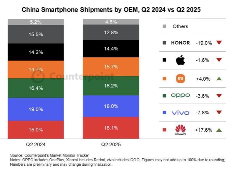 2025Q2中国智能手机市场:华为出货量第一,荣耀同比大跌19%
