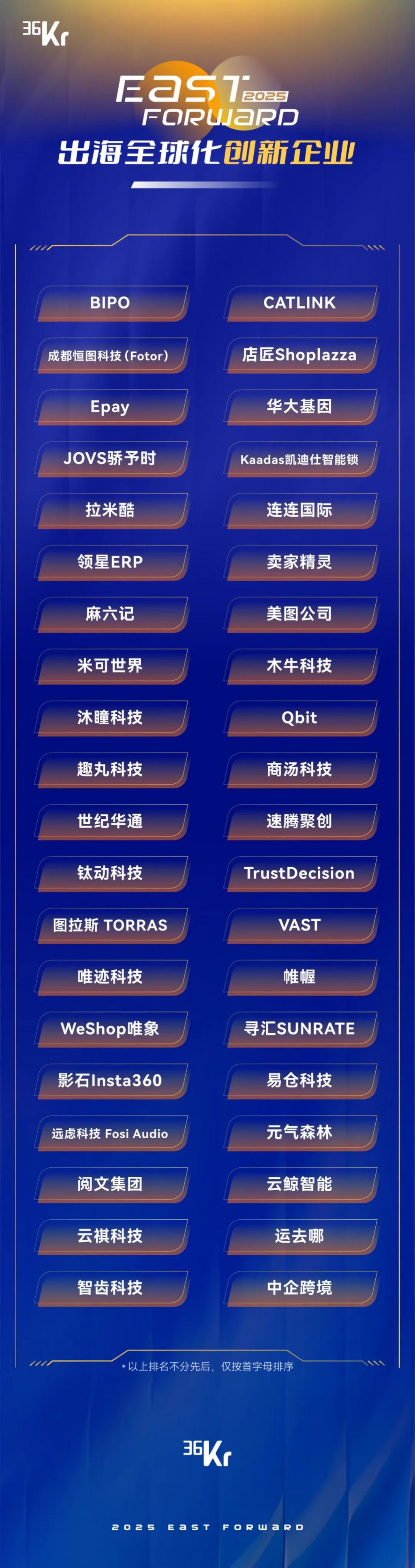 作为观察这些变化的切入口,36 氪发起的 East Forward 2025 出海全球化创新系列名册,正是一个极具代表性的观察样本。它并不试图直接给出答案,而是提供方向指引:什么样的路径具有可复制性?什么样的创新能够在变化中找到确定性?