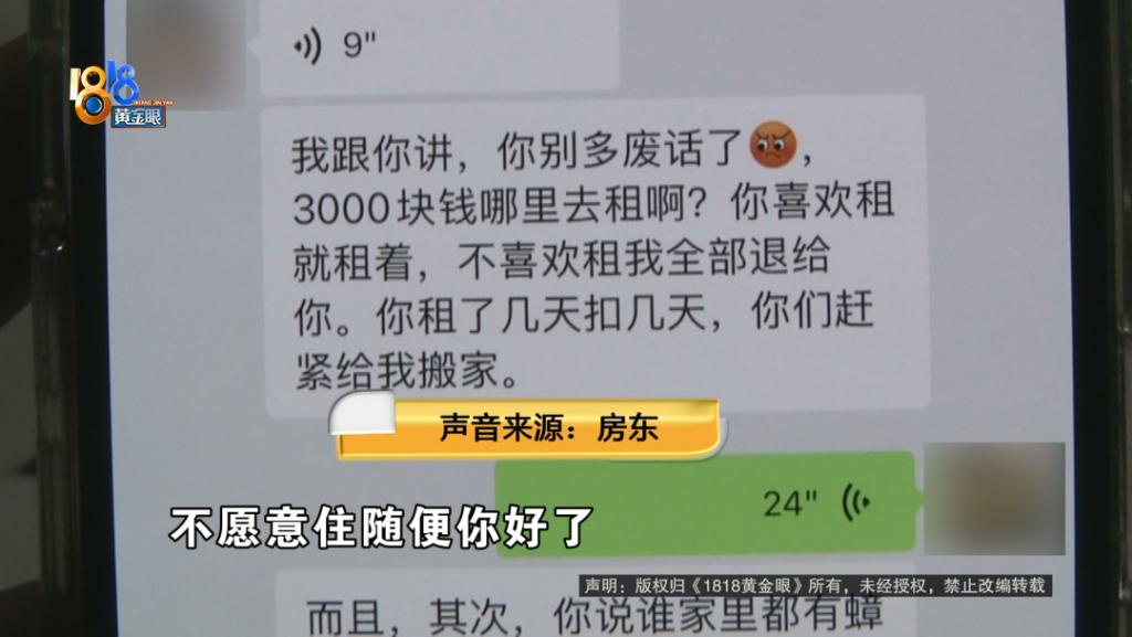 小沈:我们投诉中介的时候,没有说过房东任何的不是,因为我们觉得房东也在尽力地处理事情了。但是没想到房东依旧来责怪我们,觉得我们小年轻事情多,觉得供不起我们这尊 " 大佛 "。当时是说,你不爱住的话,我全部退给你们,赶紧走。