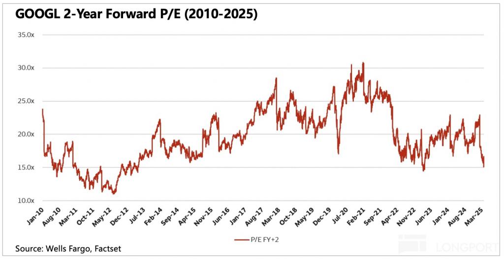 上季度点评中,由于今年关税影响不确定,因此海豚君引用了谷歌在 2 年预期的 Forward P/E 历史变化,圈定 12x~15x 是谷歌历史估值底部,短期下有这种击球区的机会,值得一试。鉴于关税影响放缓,如果还是按照正常增长趋势,那么谷歌 1 年期的 Forward P/E 估值区间范围,也就是大约 15x 的底部,22x 的中枢,以及 30x 的乐观。