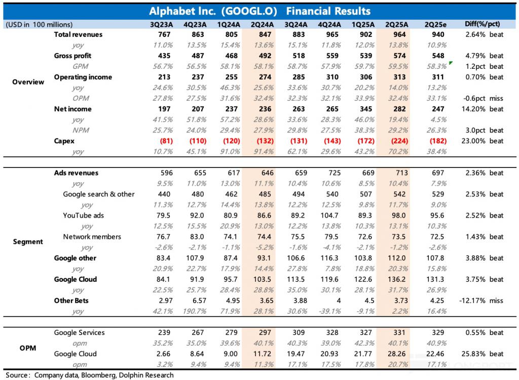 4. 其他收入增势强劲:二季度增速加速到了 20%,增长驱动应该还是主要来源于 YouTube CTV 和 Google One 的订阅收入。