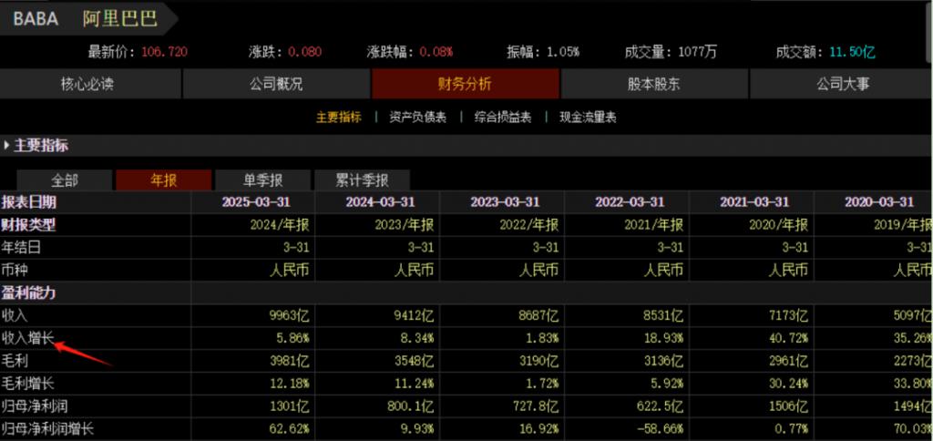 阿里的境况与京东类似。2022 年 -2024 年,阿里的营业收入增长分别为 1.83%、8.34%、5.86%,在 2021 年以前,阿里的营收可都是以 2 位数的速度增长。