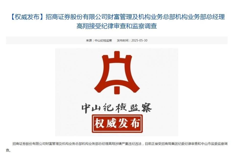 5 月 30 日,广东中山市纪检监察发布招商证券财富管理及机构业务总部机构业务部总经理高翔接受纪律审查和监察调查消息,高翔因涉嫌严重违纪违法,目前正接受招商局集团纪委纪律审查和中山市监委监察调查。