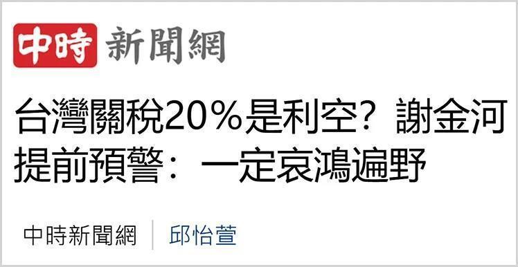 台湾《财讯双周刊》社长谢金河表示,税率只要高于 15%就都是利空," 台湾一定哀鸿遍野 "。台湾三三企业交流会理事长林伯丰也称,产业界非常不乐意看到这样的结果。还有台湾投资顾问公司预估,美关税政策将大幅影响台湾 GDP 年增长率。可见,20% 的关税大棒对台湾产业界来说,是 " 不可承受之重 "。