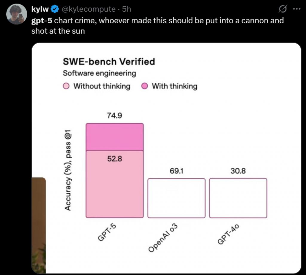不过,OpenAI 的翻车变成了第一个出圈的讨论。在发布会演示的现场,OpenAI 上来就犯了一个非常严重和低级的错误:在现场展示的图表中,数字大小和柱状图显示的关系甚至都匹配不上,69.1 和 30.8 的柱图高度一模一样,52.8 甚至比 69.1 更大 ......