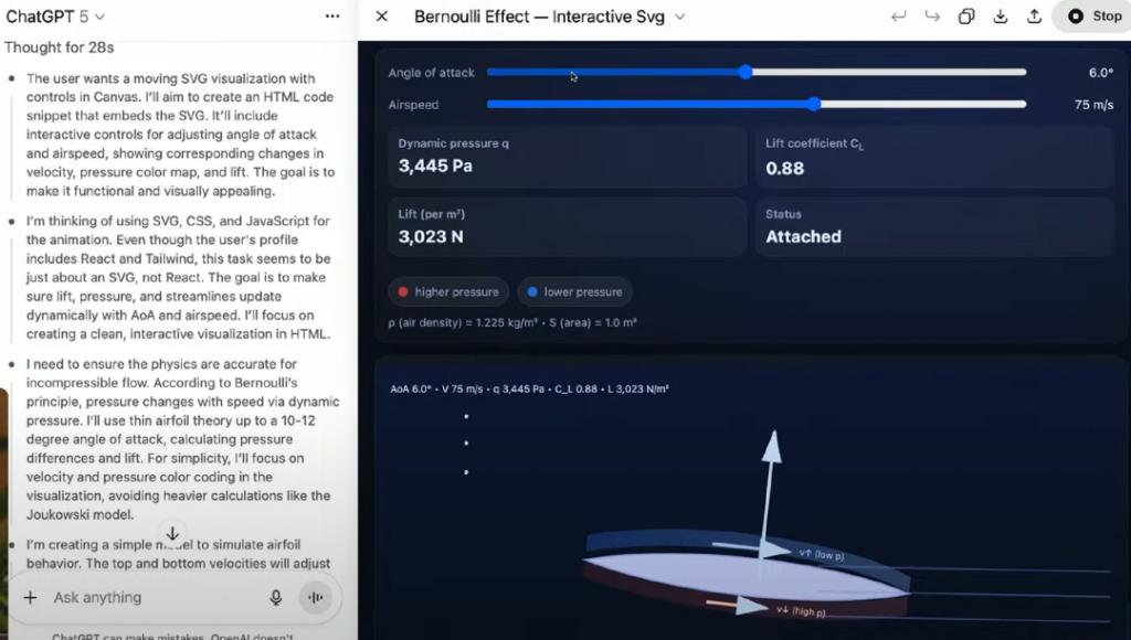 发布会现场,OpenAI 通过一些案例具体展示了 OpenAI 的编程能力,比如让它做一个阐释伯努利效应的网页,在两分钟内,GPT-5 跑出了 400 行代码,做了一个支持调整参数的网页版本。