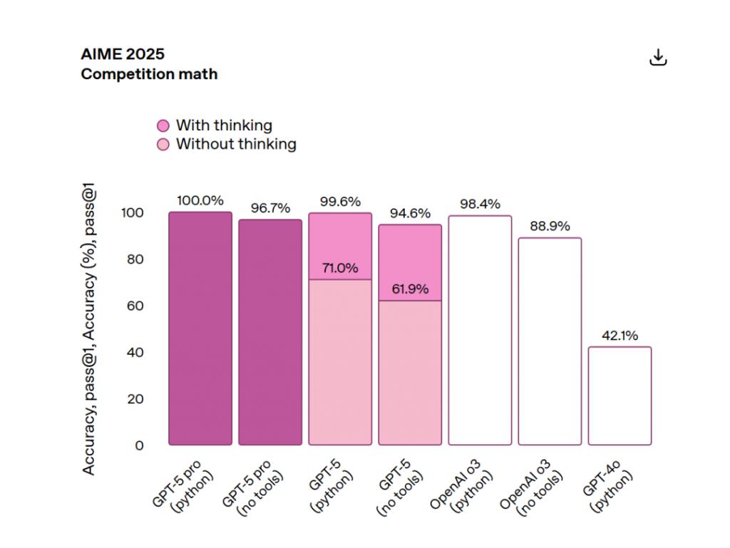 GPT-5 再次向我们证明了 " 模型即产品 " 的观点可行性——加上工具能力的 GPT-5 pro,它甚至能直接把 AIME 2025(美国数学竞赛)的测试刷满分。