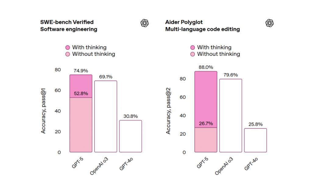 在 SWE-Bench(测试大模型代码补全能力)的指标上,GPT-5 的推理版本拿到了 74.9%,不仅超越了自家模型 O3,也超越了 Anthropic 刚发布的 Claude Opus 4.1(74.5%)。在编程能力上,OpenAI 抢过了 Claude 系列的王座。