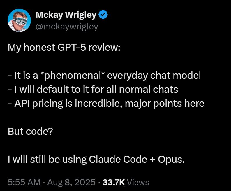 本月,在 OpenAI 发布两个开源模型的当天,Anthropic 早其十几分钟,发布了小更新版本 Claude 4.1。特别是在这家公司还预告了 " 大幅度更新模型 " 即将在本月发布的情况下,0.4% 的微弱差距,很难让人对 OpenAI 保持乐观。