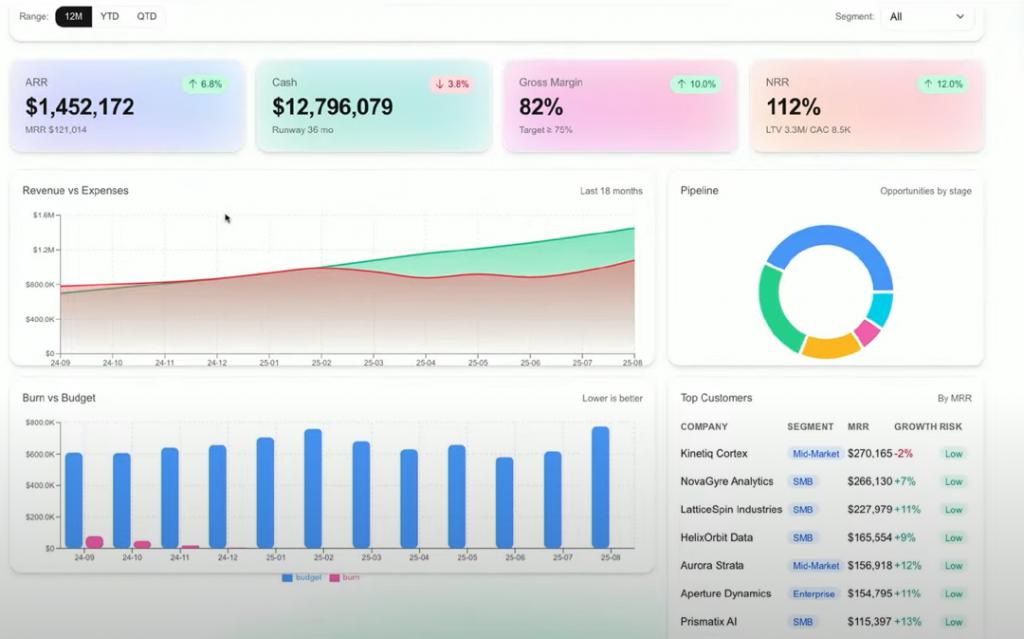 除了这种面向 C 端用户体验的案例,在 B 端实际使用上,OpenAI 也面向开发者演示了 GPT-5 写代码落地的能力,GPT-5 不再埋头写代码,而是把 " 开箱可用 " 的落地能力夯实了。比如,GPT-5 在后台写代码并自行优化迭代之后,按照需求开发了一个财务信息看板,UI 做得也足够漂亮。