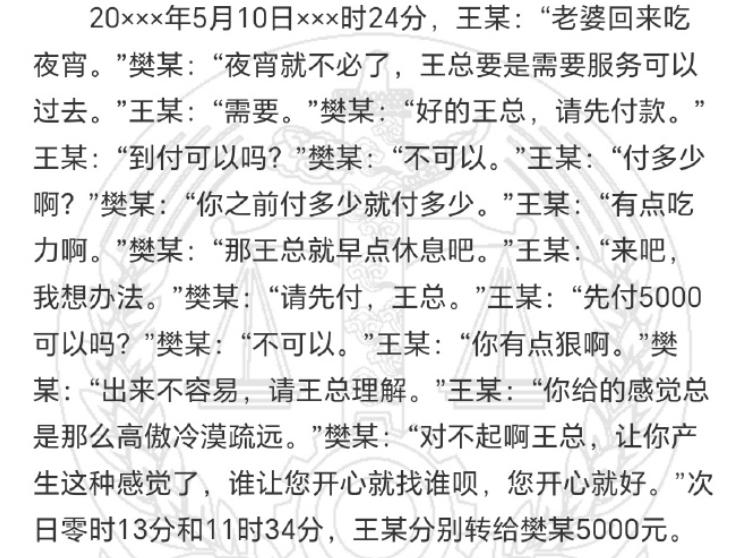 从款项交付情况看,王某向樊某转账的时间没有任何规律,不具有定期支付包养费用的特征。转账金额中除了第一次为 1300 元以及几笔千元以下外,每笔或者每日转账金额至少在 5000 元以上,符合樊某主张的服务价格。另外,王某曾经通过微信及欠条形式确认欠付樊某款项,该行为明显不符合情人关系特征,反而印证了樊某关于王某拖欠服务费的说法。