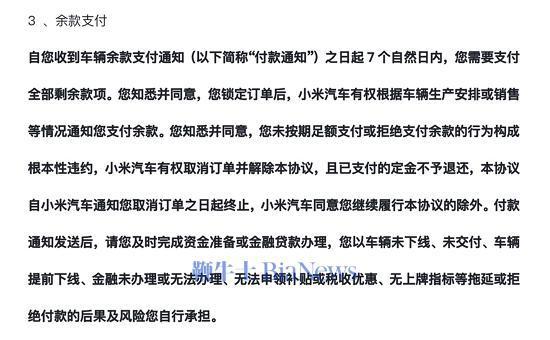 查看小米汽车购车协议,关于 " 余款支付 ",是这么说的:用户锁定订单后,小米汽车有权根据车辆生产安排或销售等情况通知其支付余款;自收到车辆余款支付通知 ( 简称 " 付款通知 " ) 之日起 7 个自然日内,用户需要支付全部剩余款项;未按期足额支付或拒绝支付余款的行为构成根本性违约,小米汽车有权取消订单并解除本协议,且已支付的定金不予退还;协议自小米汽车通知用户取消订单之日起终止,小米汽车同意继续履行本协议的除外。