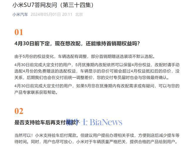 小米汽车曾在答网友问中明确表示小米支持验车后再付尾款
