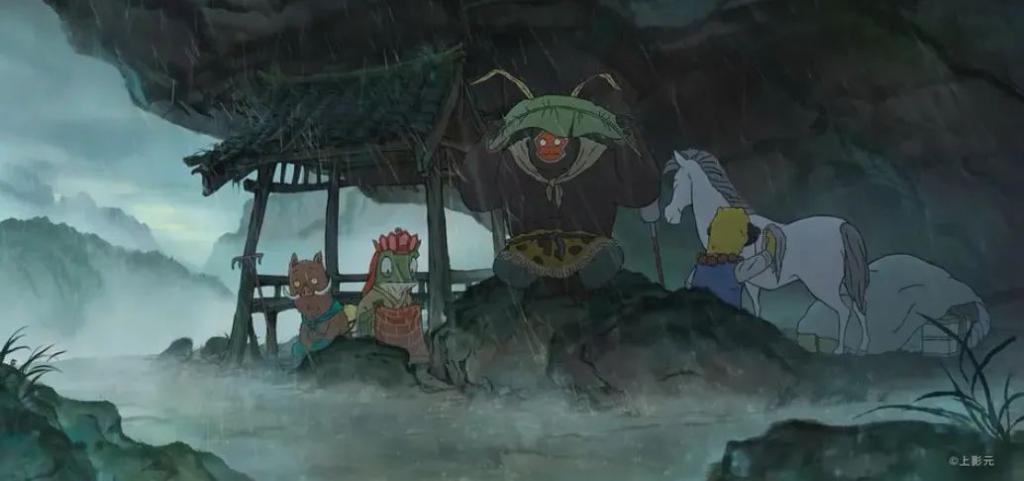 从另一个角度来看,影片的结尾又没有冷峻、绝望到底,且还保留了短片中 " 大圣赐毫毛 " 的泪点。但私以为,既然都掀翻了特权阶层的桌子,这种上位者的恻隐最好拿掉。同理还有小野猪躲在路边草丛里,看着正牌唐僧师徒经过时眼中流露的崇拜和惊奇感,立意瞬间垮了半截。相比之下,让村民给几个恩人修土地庙,倒是更宽厚又人味儿拉满的选择。