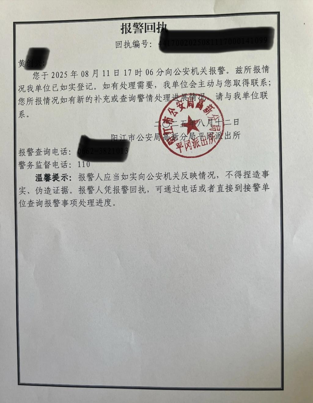 这名男子发出了买药的发票和店员与他老婆的聊天记录,还发出了一张阳江市公安局高新分局平冈派出所 8 月 12 日开出的报警回执,显示其于 2025 年 8 月 11 日 17 时 06 分报警,情况已经如实登记,如有处理需要,会主动联系。