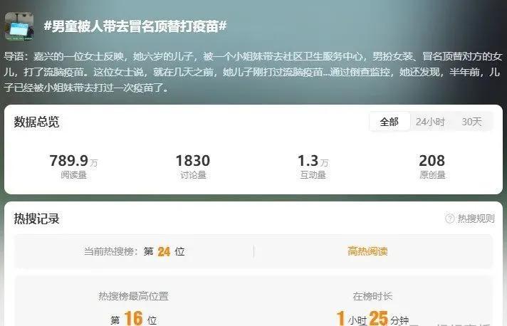 话题 # 男童被人带去冒名顶替打疫苗 # 冲上热搜