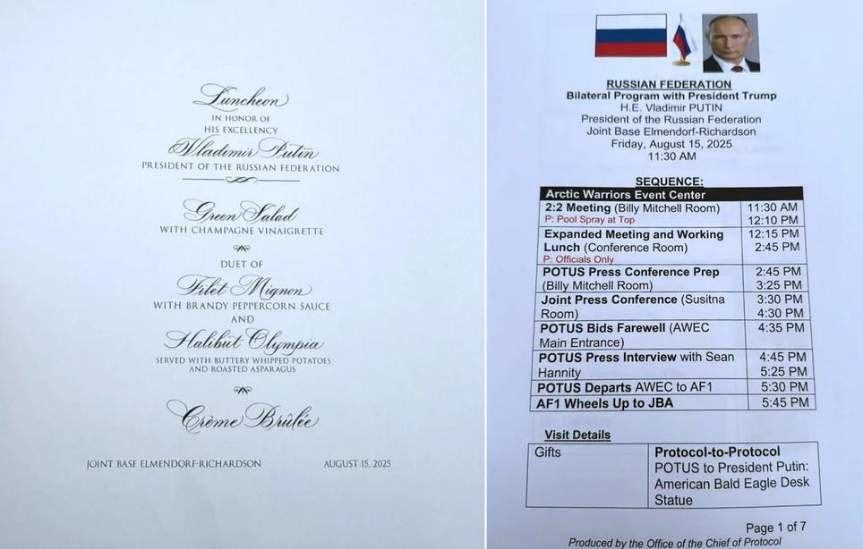 根据获取到的文件,第一页列出了 8 月 15 日的会议日程,包括位于安克雷奇基地的特定房间名称,以及这些会议将在哪里举行。资料中还透露,特朗普打算向普京赠送一份仪式性的礼物—— " 美国白头鹰桌饰雕像 "。
