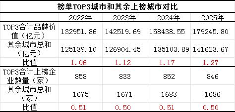 值得关注的是,品牌价值向头部城市集聚的趋势仍在强化。2025 年,北京、深圳、上海的品牌价值总和与其余 TOP100 城市总和之比为 1.27,高于 2022 年的 1.06。