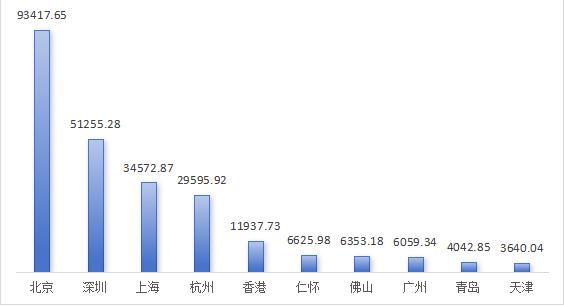 根据 " 城市榜 TOP100",北京、深圳、上海名列前三,优势明显,上榜企业的品牌价值之和达到 179245.80 亿元,超过其余 TO100 上榜城市的总和(141623.67 亿元)。